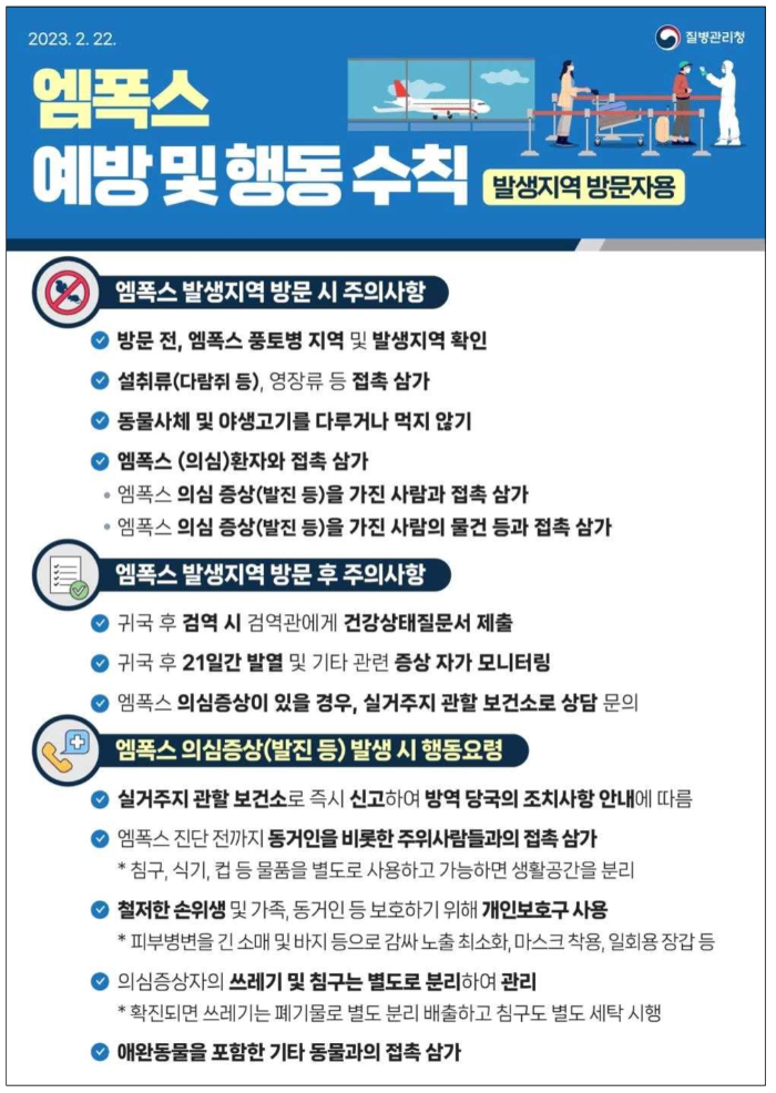 질병관리청에서 엠폭스 누적 확진자가 13명으로 늘어나면서 위기경보를 '주의'로 격상하였습니다. 엠폭스(원숭이두창) 예방 및 행동수칙 중 발생지역 방문자용에 대해 알려드립니다.