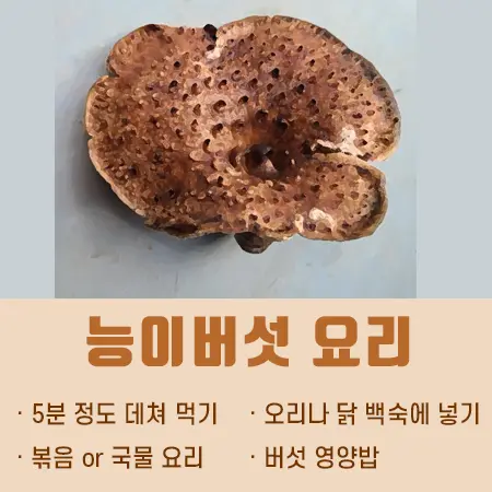버섯은 가열해서 먹어야 한다는 사실 많이 알고 계실 겁니다. 능이버섯 역시 생으로 먹는 것이 아닌 가열해서 섭취해야 합니다. 능이버섯 요리에는 숙회로 5분 정도 데쳐서 먹고, 오리나 닭백숙에 넣어 먹으면 향과 함께 영양까지 챙길 수 있습니다. 버섯은 볶음이나 국물 어떤 요리에도 다 잘 어울리니까 취향에 맞게 요리할 때 넣어 드시면 됩니다.